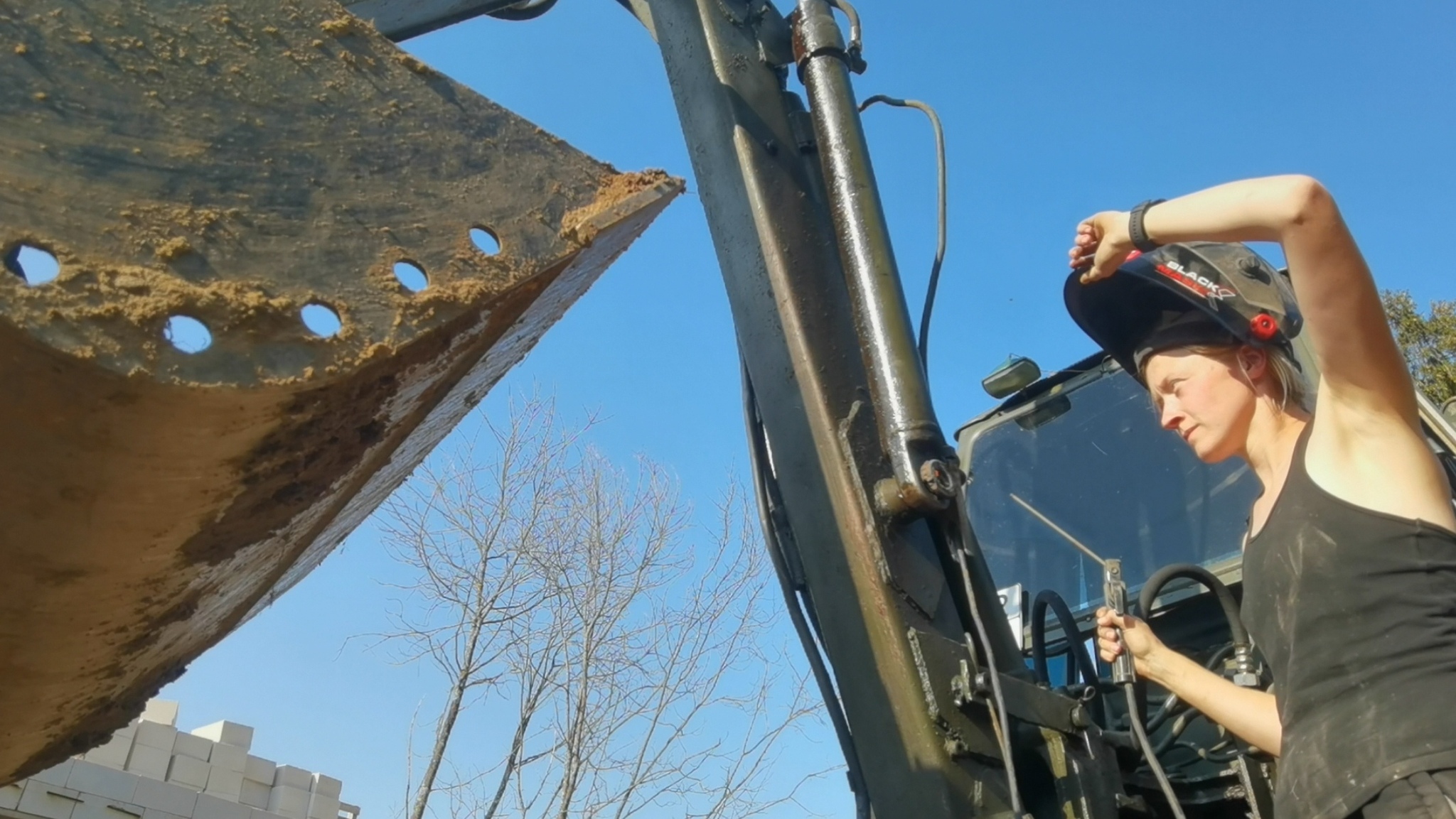 Что сказать за целостность конструкции? Ну, конечно, трактор слегка уставший, всё-таки он 1989 года выпуска. Порой приходится что-то подварить, например тут недавно отлетела гайка с пальца, фиксирующего часть стрелы. Я подумала-подумала да и приварила её назад.