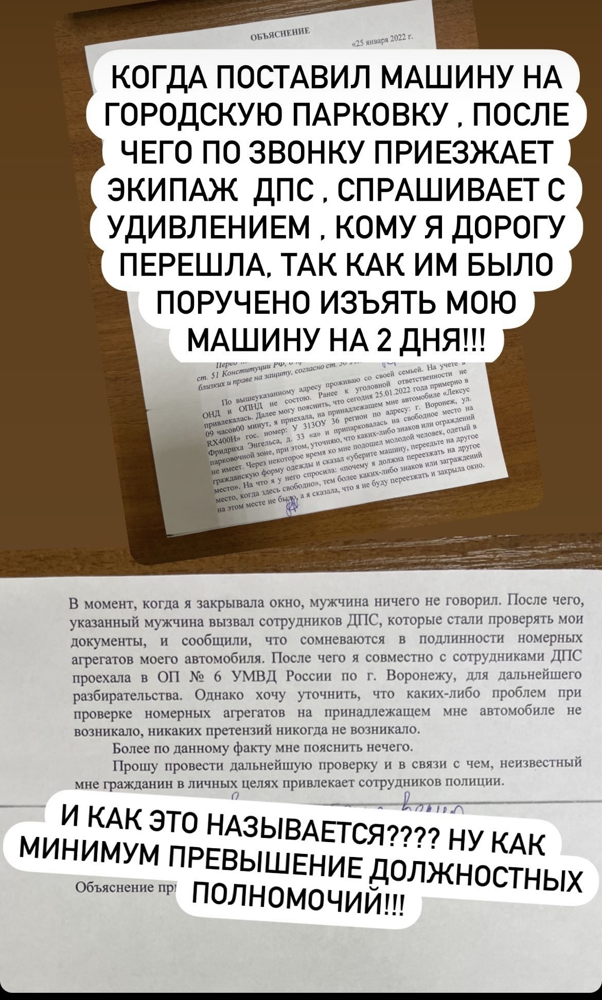 Я- мать троих детей. Супруг в командировке. Заступиться некому. Вот так у нас в Воронеже бывает : приедешь на свободное место обычной городской парковки, тебя попросят найти себе место где-нибудь и в случае отказа выполнить их действия, натравят полицию. На процессуальное оформление имеется много недочётов , машина находилась на территории отдела не опечатана, при изъятии автомобиля не было понятых. Не думали полисмены, что я возьмусь и начну собирать весь материал, чтобы составить жалобу! Надоело, что против гражданина легко могут использовать должностное положение в личных целях!