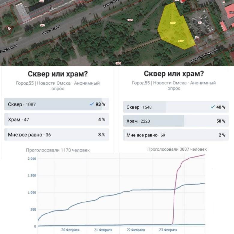 Омскую епархию заподозрили в накрутке голосов за храм. Опрос о том, что нужнее городу — зеленая зона возле сквера Молодоженов или храм, который епархия планирует на ней построить, опубликовали в паблике издания «Город 55» 19 февраля. Большинство пользователей выбрало сквер, однако спустя несколько дней произошел резкий наплыв голосующих, в том числе из других стран. Днем 23 февраля в опросе насчитывалось 93% голосов за сквер и 4% — за храм, но в промежутке между 14.00 и 18.00 случилось чудо и число поддержавших строительство храма выросло до 61,4%. Общее количество проголосовавших увеличилось с 1,1 до 3,4 тысяч человек. Проголосовать за храм успели пользователи из Украины, Казахстана, Республики Беларусь, а также из Москвы и Санкт-Петербурга.