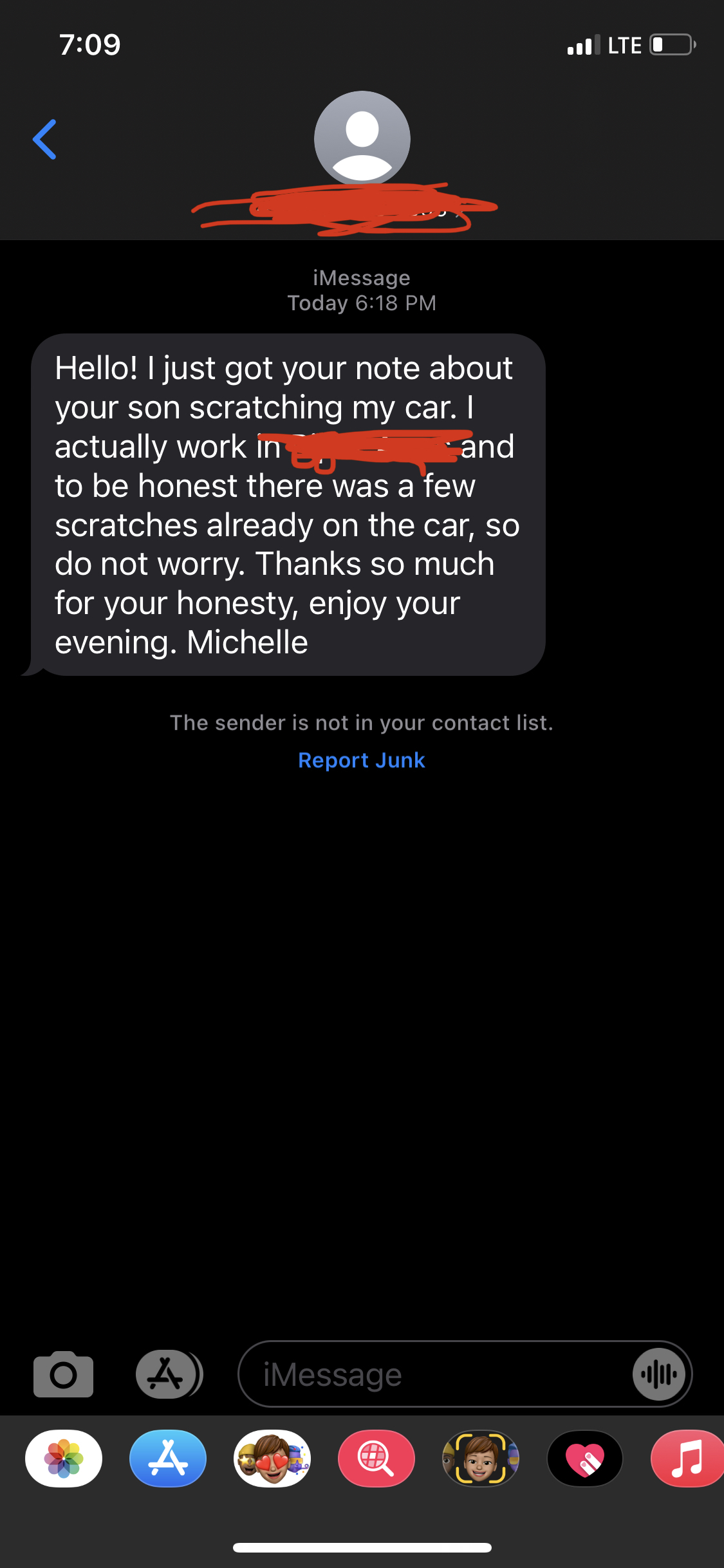 "Привет! Только что получила Вашу записку о том, что Ваш сын поцарапал мою машину. Я, на самом деле, работаю в %кафе% и, если честно, там уже было несколько царапин, так что не переживайте. Большое спасибо за честность, хорошего вечера. Мишель"