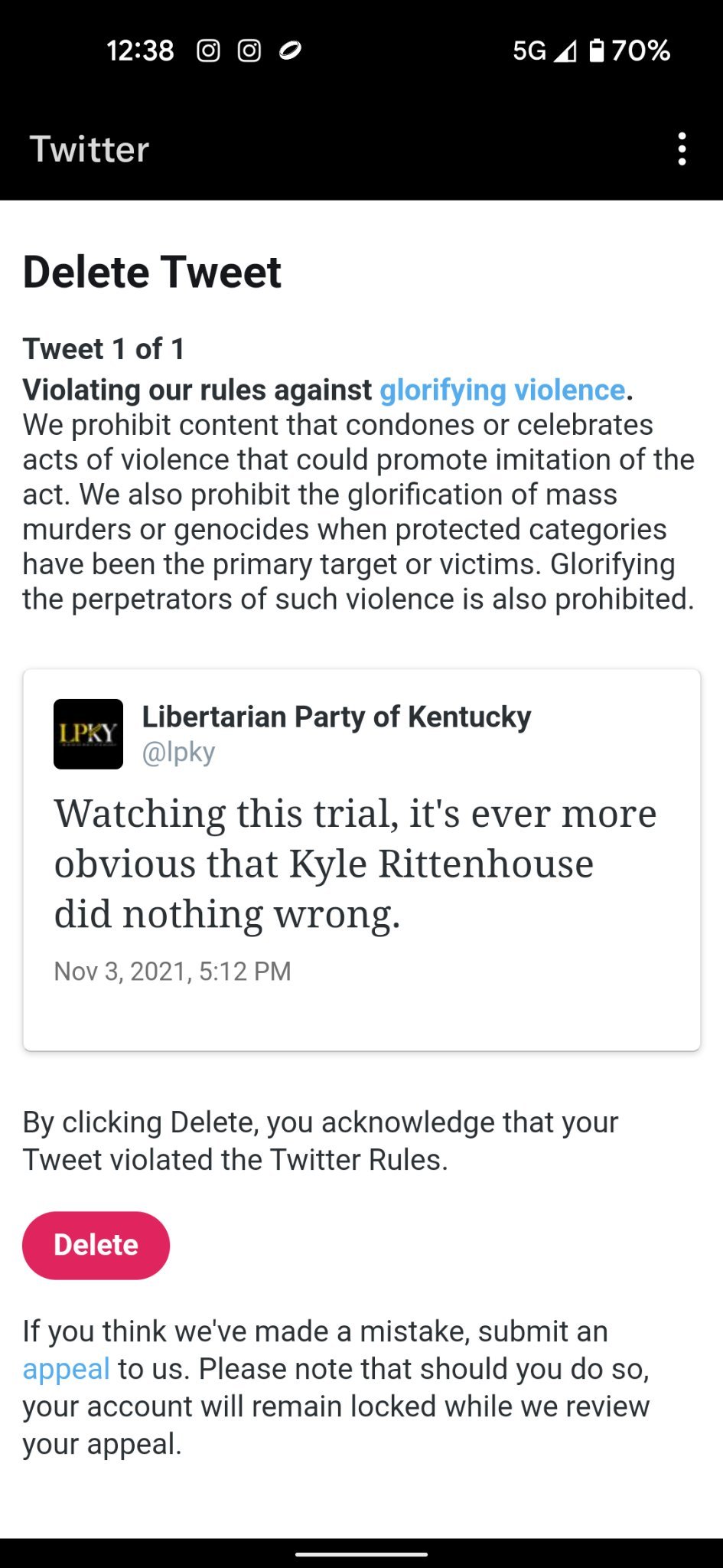 Twitter заблокировал страницу Либертарианской партии Кентукки за нарушение правил, которые запрещают прославление насилия.