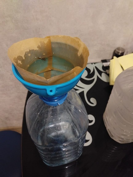 Дома эту воду пропустили два раза через бумажные фильтры для кофе, чтобы убрать всякий мусор.