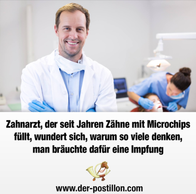 Что не так с этими людьми? С самого начала пандемии Covid-19 стоматолог Йорг Кёлер из Бремена не перестаёт удивляться. "Почему ковид-диссиденты так боятся микрочипов в вакцинах? Мы, стоматологи, уже несколько десятилетий подряд вставляем микрочипы в пломбы, и пока что никто не жаловался. Вживлять чипы через прививку - это же абсолютно нереалистично! Они же должны быть микроскопически малы, чтобы пролезть через иглу шприца. А вот в пломбе полно места! В коренной зуб взрослого человека без проблем помещается целый процессор "Пентиум" и памяти на 20 терабайт (включая Windows 10). При этом зубы находятся рядом с мозгом, что сильно упрощает контроль над человеком. А к стоматологу рано или поздно приходят все! Даже самые ярые скептики попадают в мой кабинет" - заявляет Кёлер. "А если у кого-то и нет кариеса, то я просто говорю, что кариес есть, и сверлю дырку под чип в здоровом зубе, что в этом такого?"(с) Der Postillon