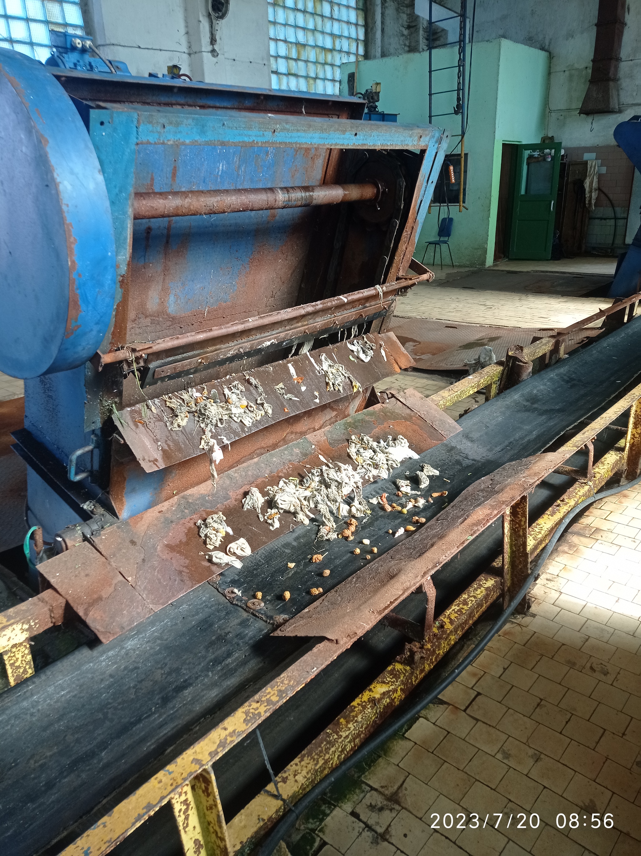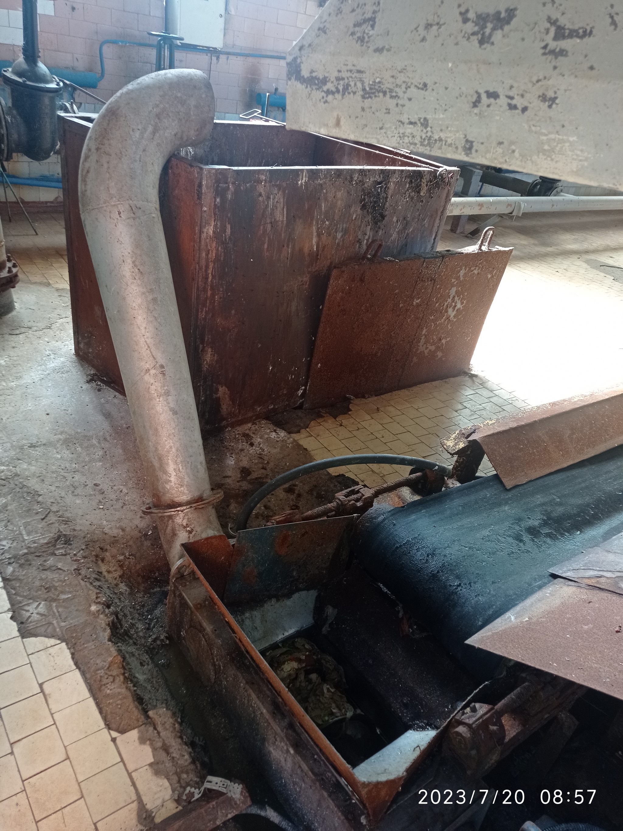 Конвейер отправляет отходы в эдакий струмок для отходов- выжимает воду, уплотняет и отправляет в бак для утилизации