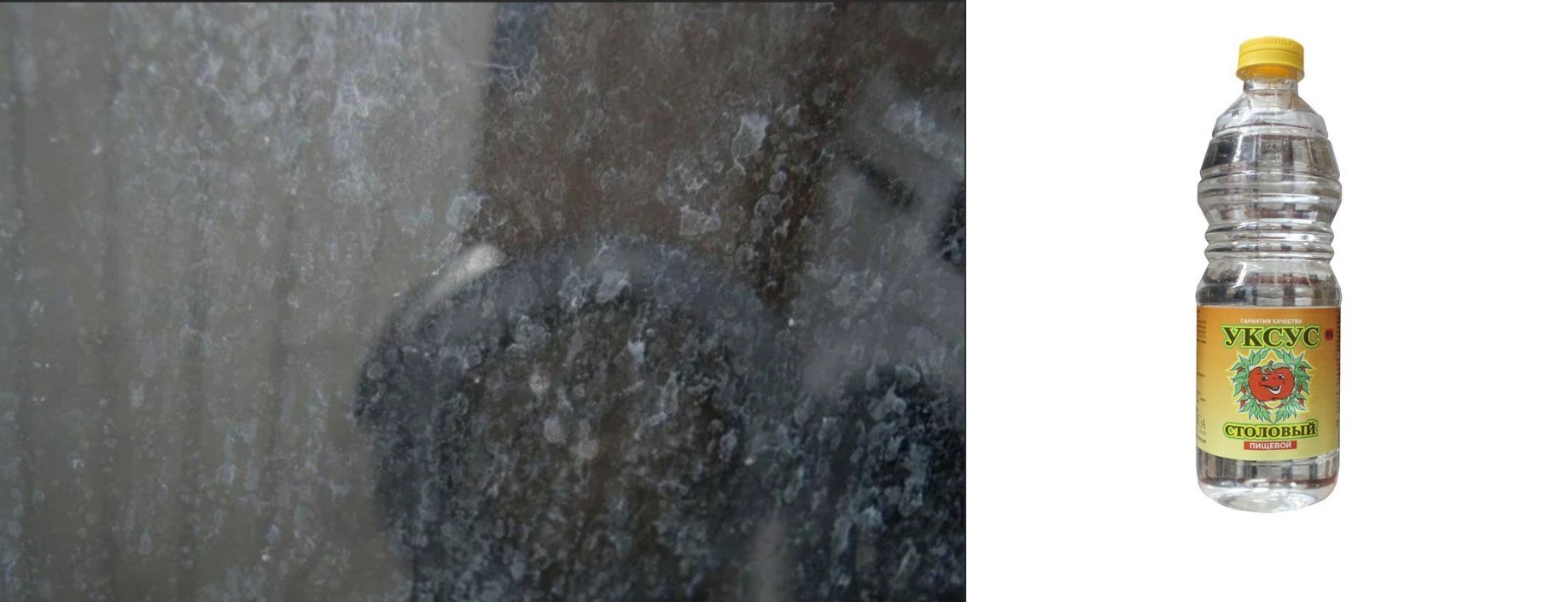 • Средство для чистки налета, в том числе и на душевой кабине - Тут покупаем обычный уксус и разводим с водой, весь налет просто смывается обычной губкой. Экономичней раз в 5