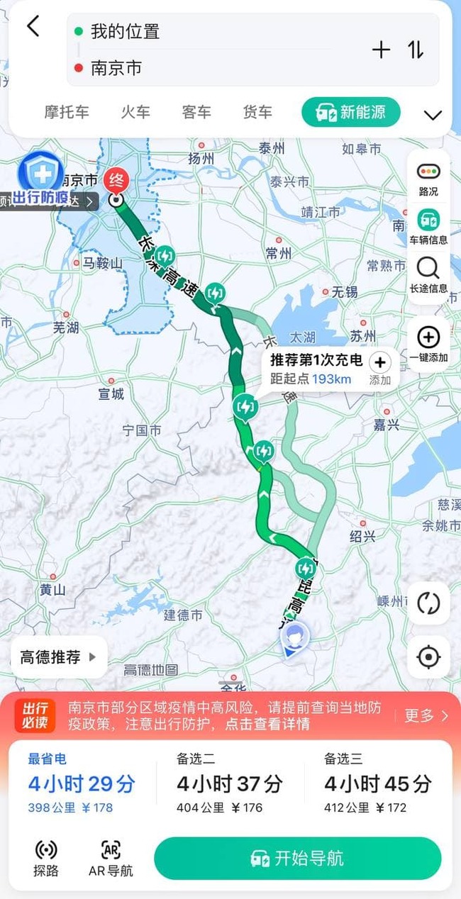 Просто в приложении, когда строим маршрут, указываем что ехать будем на электромобиле. Вот пример - я построил маршрут из Иу до Нанкина, расстояние 400 км: