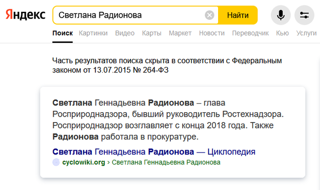 При вводе в «Яндексе» запросов «Светлана Радионова», «Светлана Радионова Франция», «Светлана Радионова Ницца» появляется сообщение «часть результатов поиска скрыта в соответствии с Федеральным законом от 13.07.2015 № 264-ФЗ», .